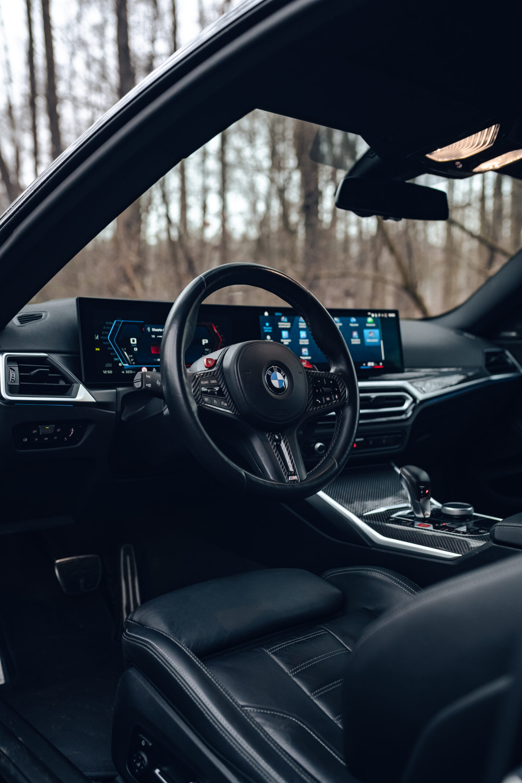 Wnętrze BMW M2 2024 łączy nowoczesną technologię z surową sportową estetyką. Kabina jest skierowana na kierowcę, a każdy element ma wspierać precyzję jazdy.