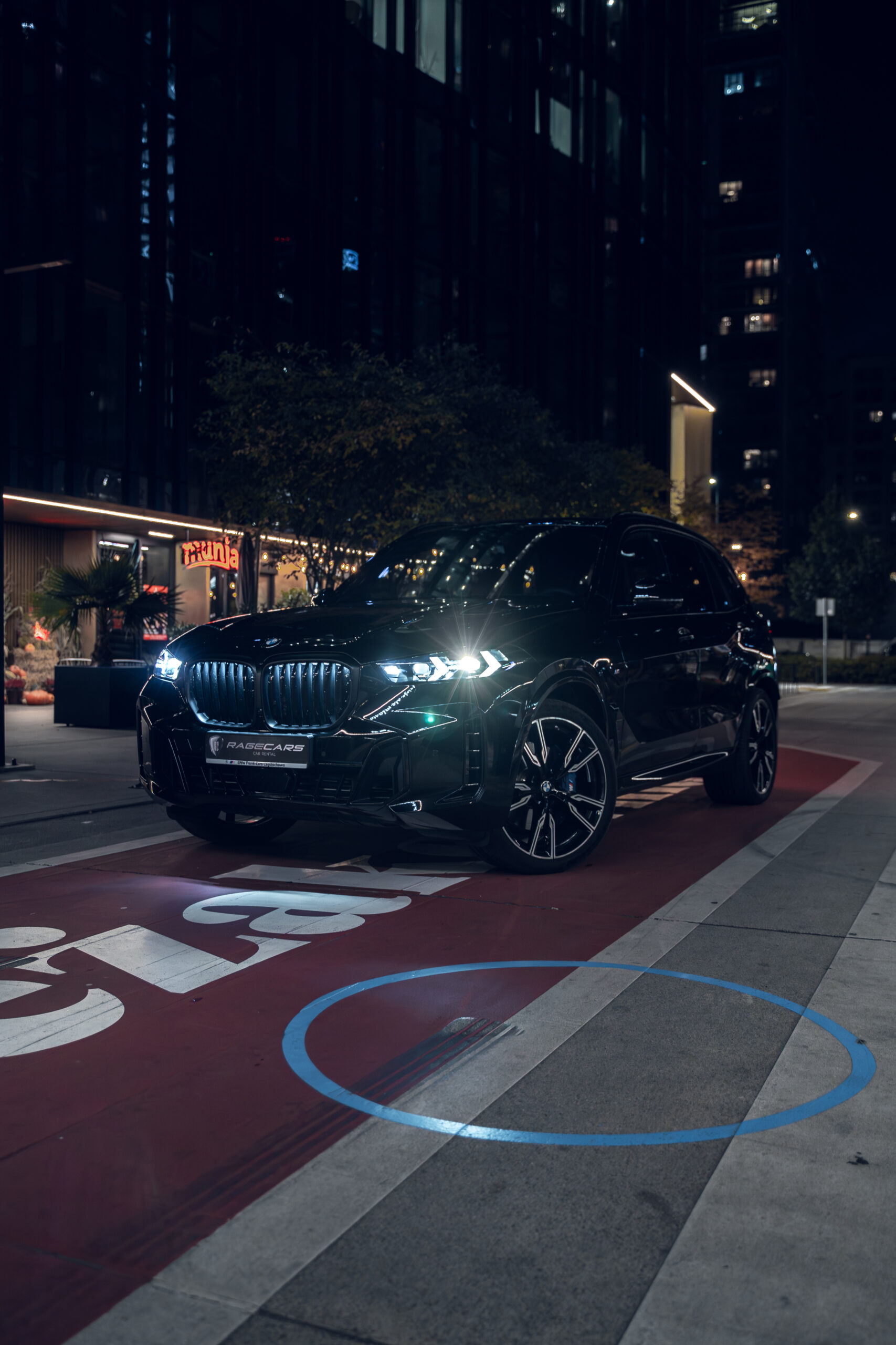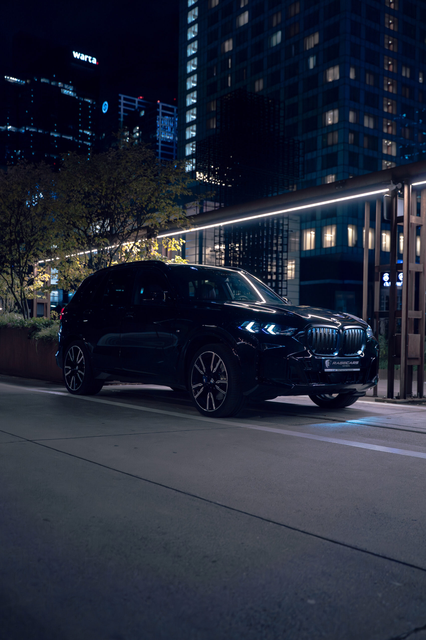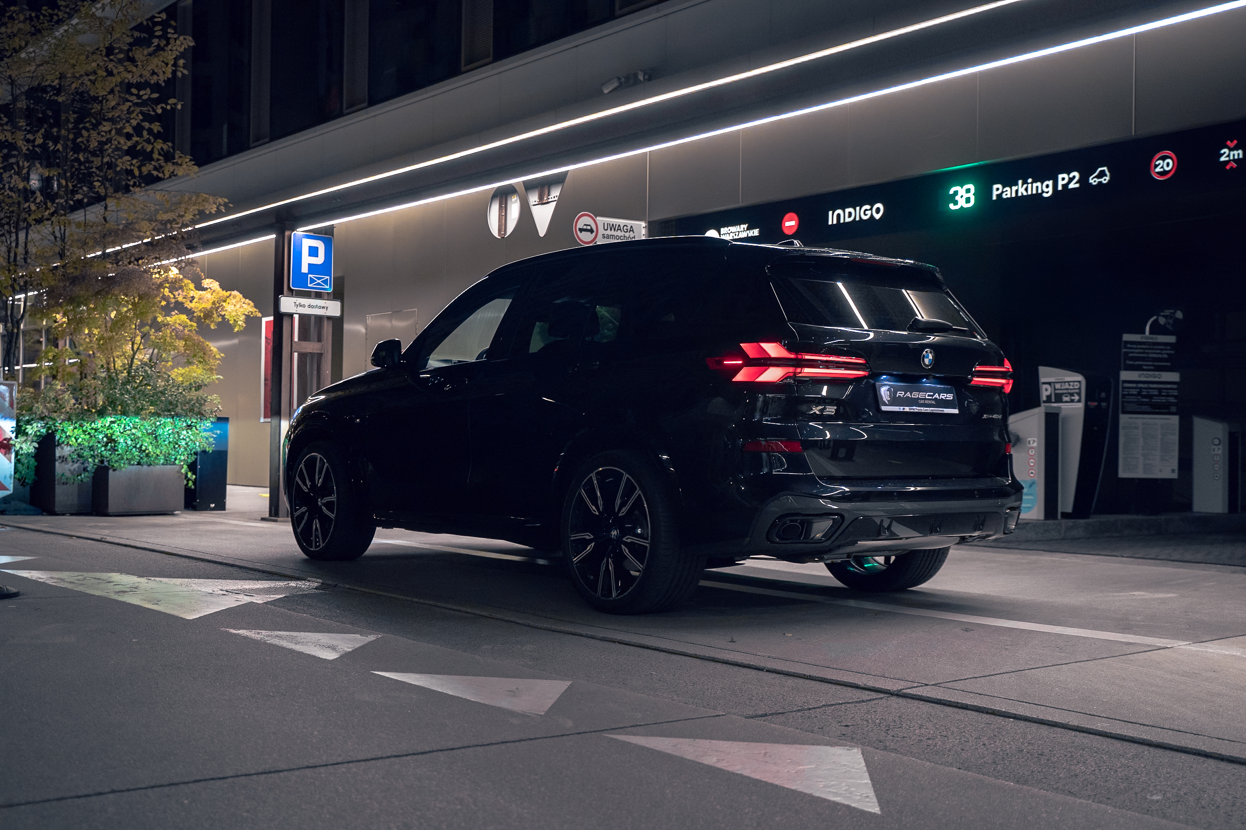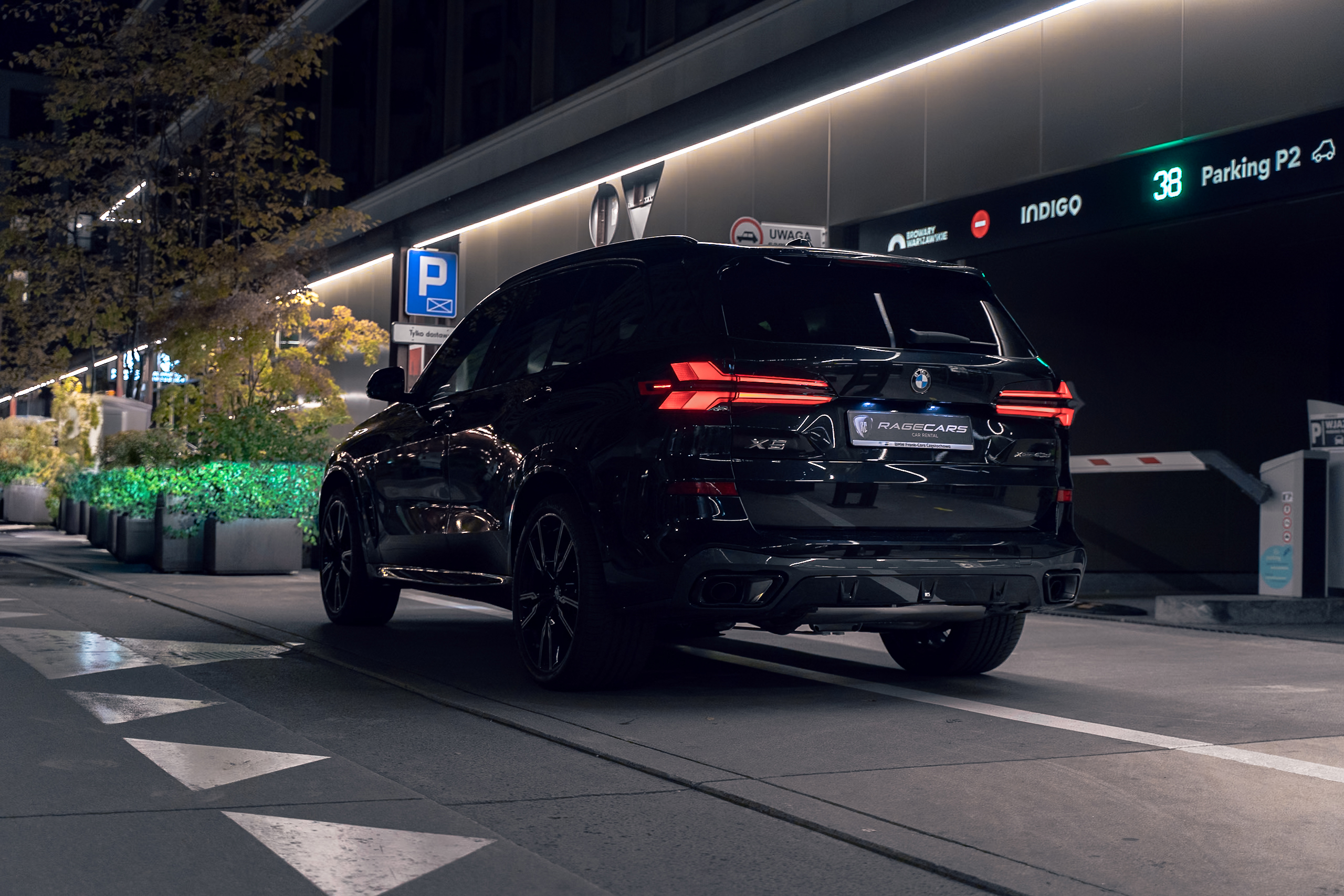 BMW X5 xDrive40d to nowoczesny SUV klasy premium, który łączy muskularną sylwetkę z eleganckimi detalami. Nadwozie w kolorze Czarny Szafir podkreślają sportowe akcenty pakietu M, w tym aerodynamiczne zderzaki, czarne wykończenia Shadowline oraz 22-calowe felgi M V-spoke 747 Bicolor. Charakteru dodają nerki BMW Iconic Glow z efektownym podświetleniem, a także reflektory LED w wersji M Shadowline. Auto wyposażono w elektrycznie wysuwany hak holowniczy oraz relingi dachowe w czarnym połysku. Dynamiczny design dopełnia sportowy układ wydechowy M i przyciemniane tylne szyby, które nadają całości elegancji i prywatności.