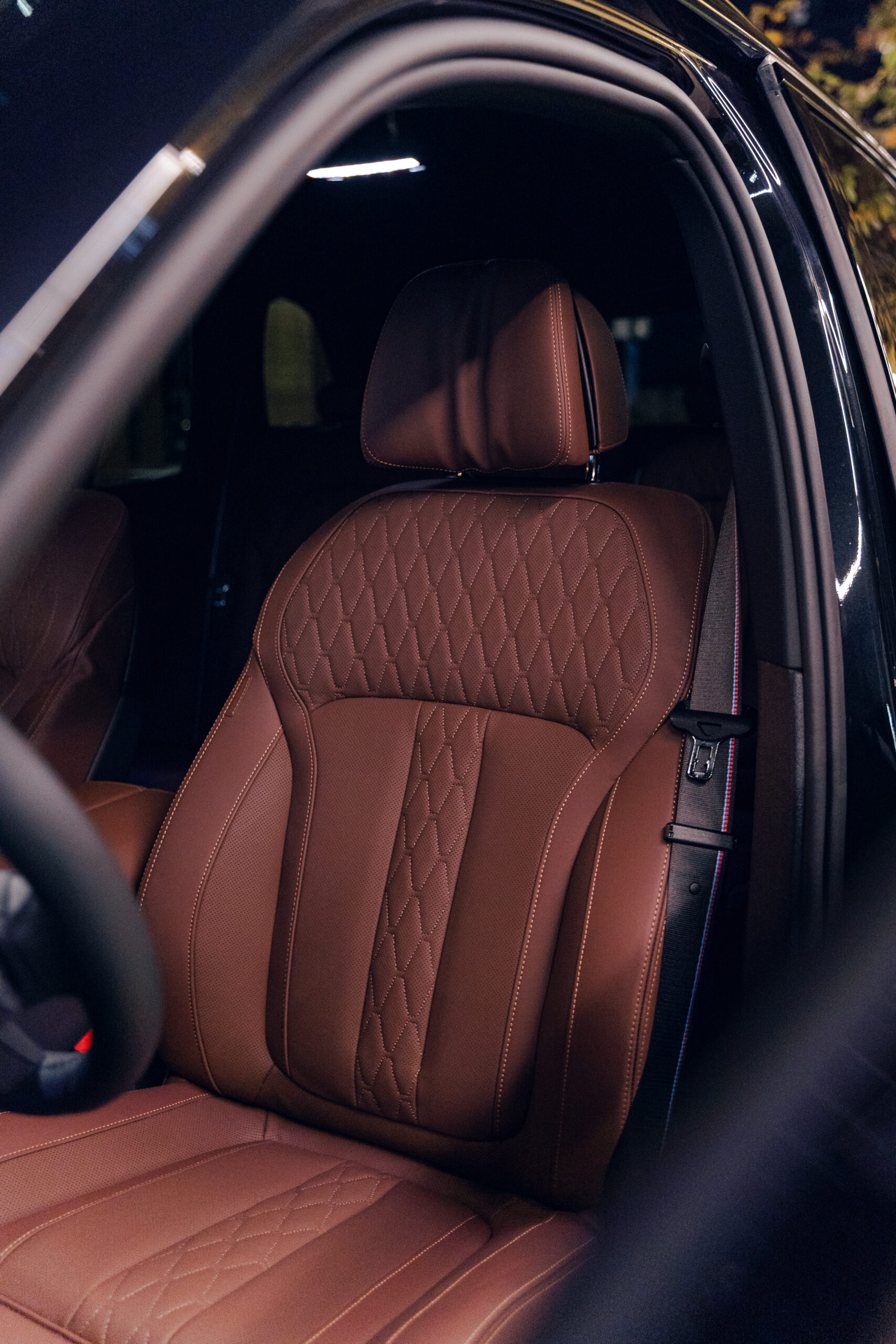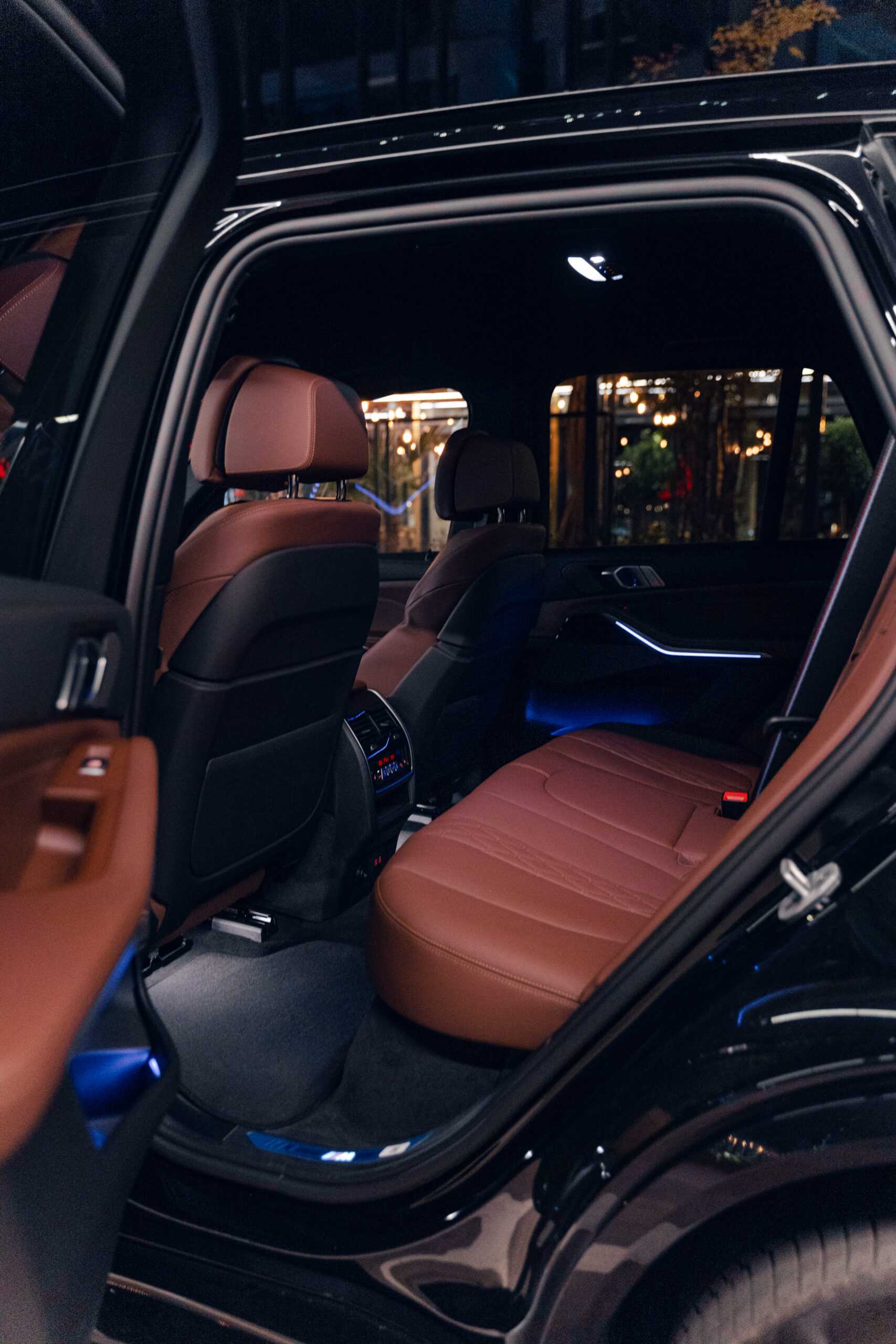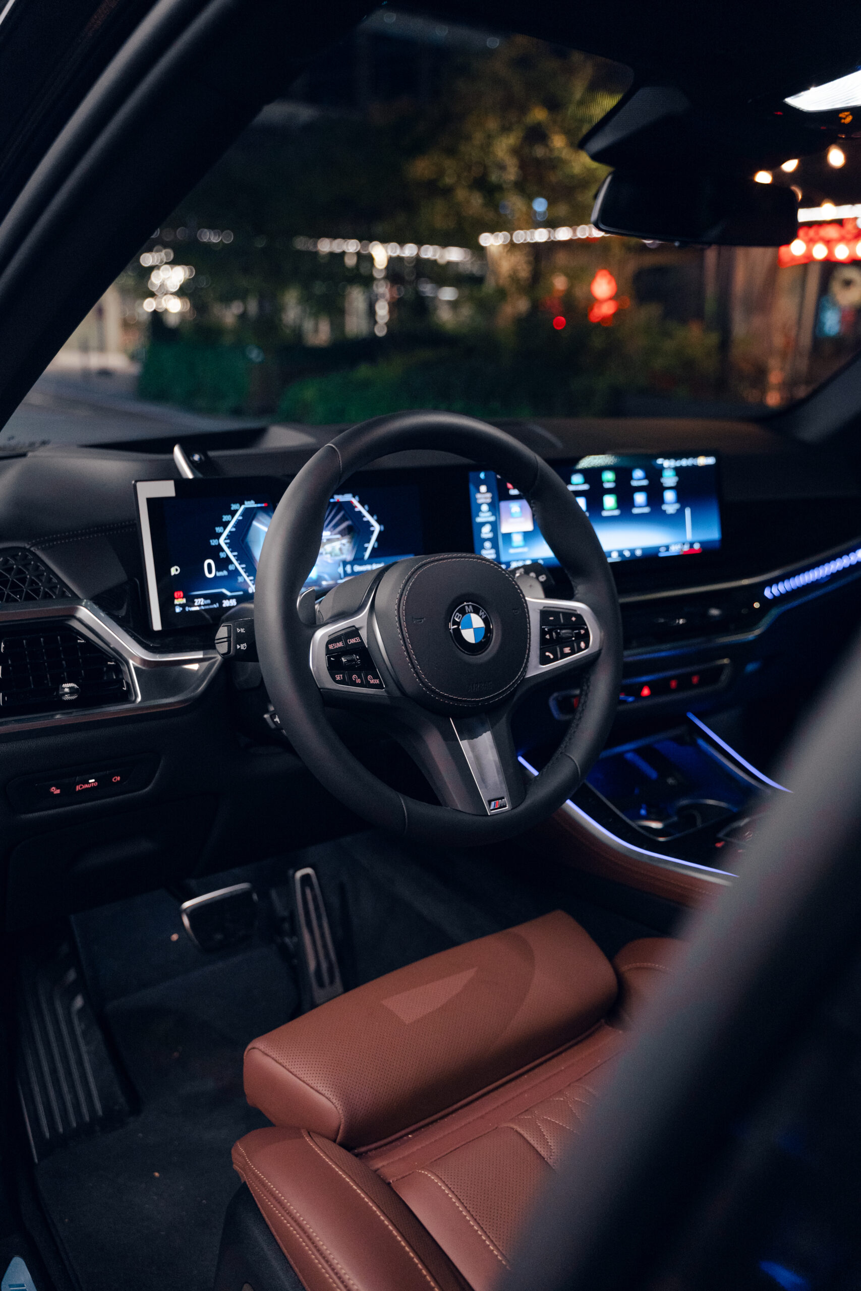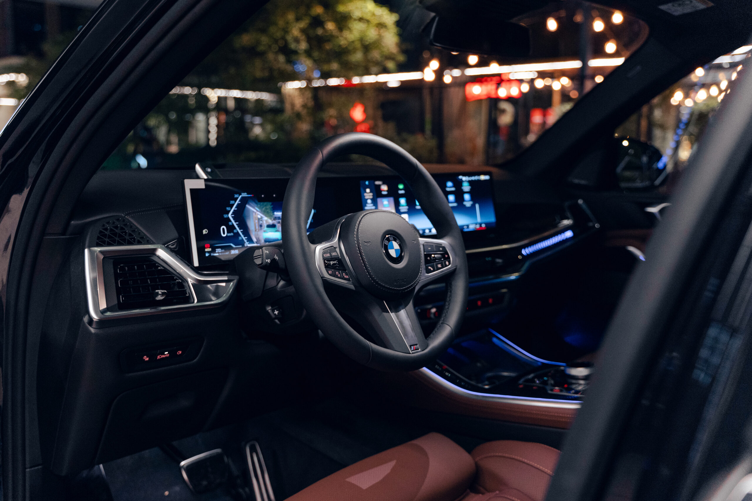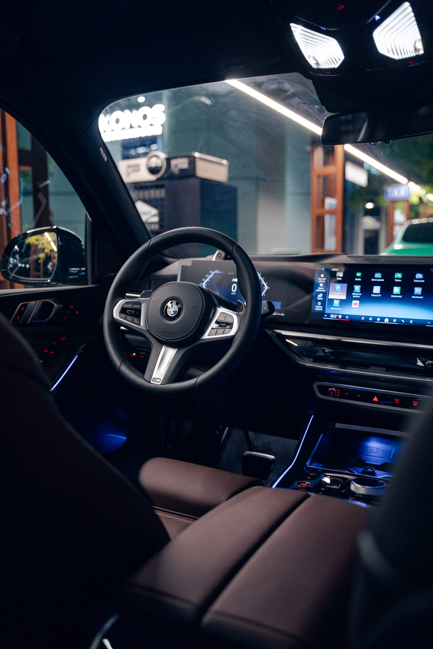 Wnętrze BMW X5 40d to połączenie luksusu i najnowszych technologii. Kabina została wykończona w najwyższej jakości skórze BMW Individual Merino w kolorze Coffee (brązowe skóry), uzupełnionej o drewniane listwy ozdobne Fineline Black z metalicznym szlifem. Komfort podróży zapewniają fotele komfortowe z wentylacją, ogrzewaniem i pamięcią ustawień, a także czterostrefowa klimatyzacja automatyczna. Kierowcę wita skórzana kierownica M oraz cyfrowy zestaw wskaźników BMW Live Cockpit Professional.
