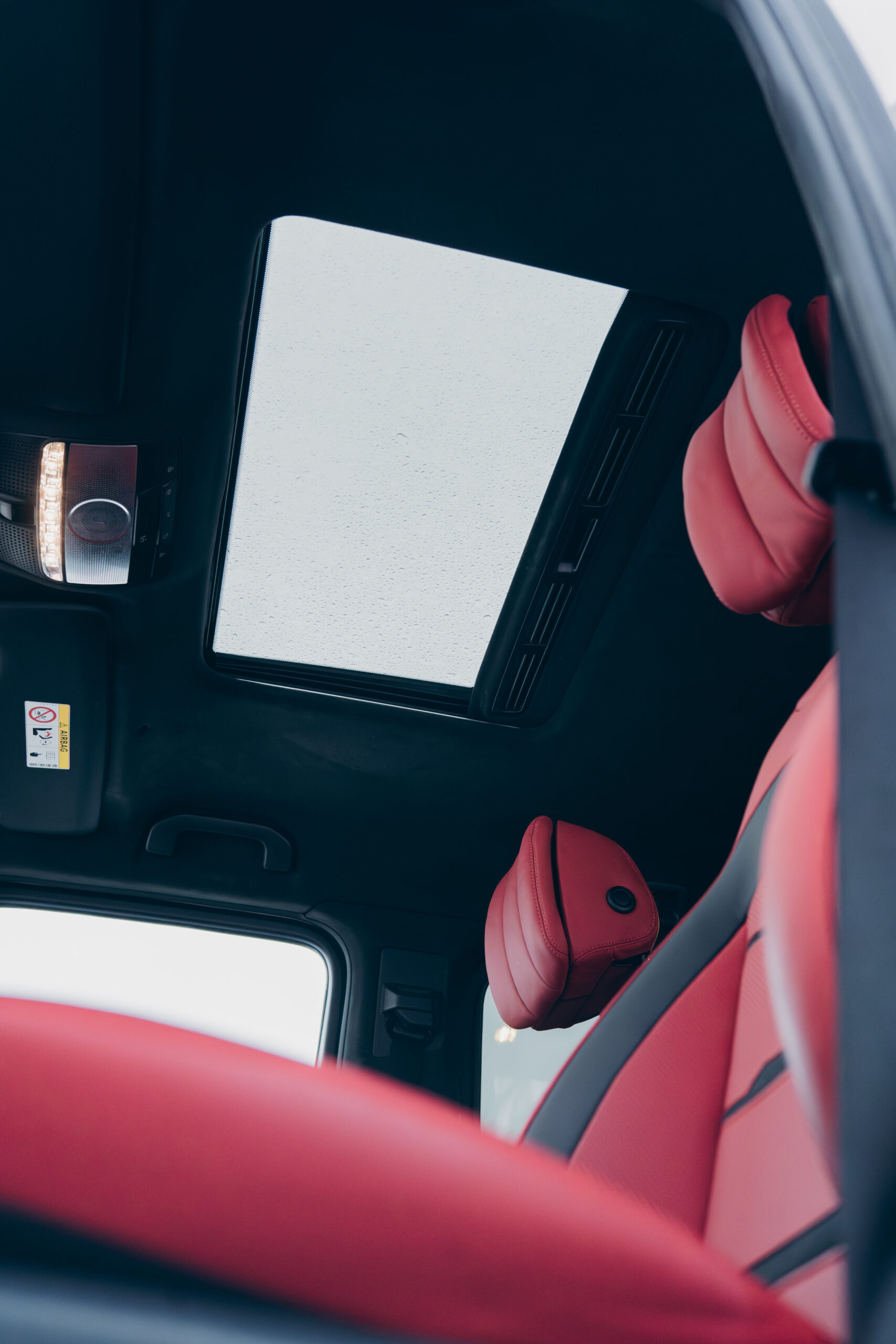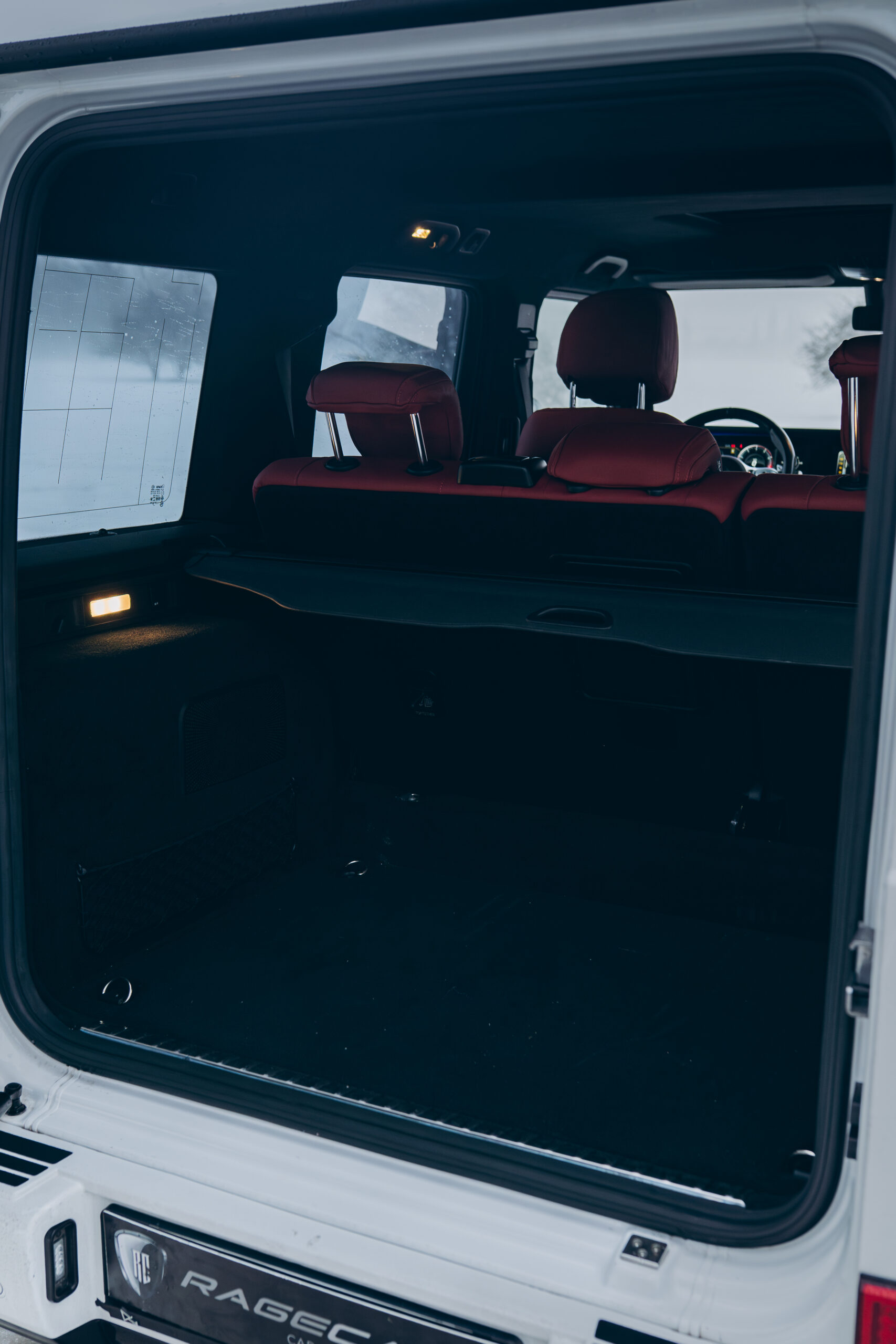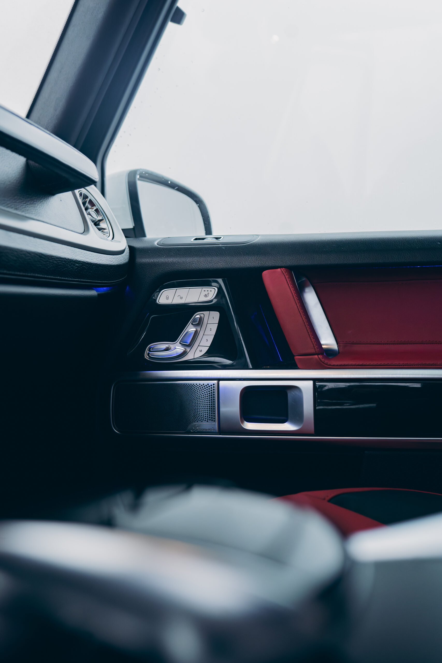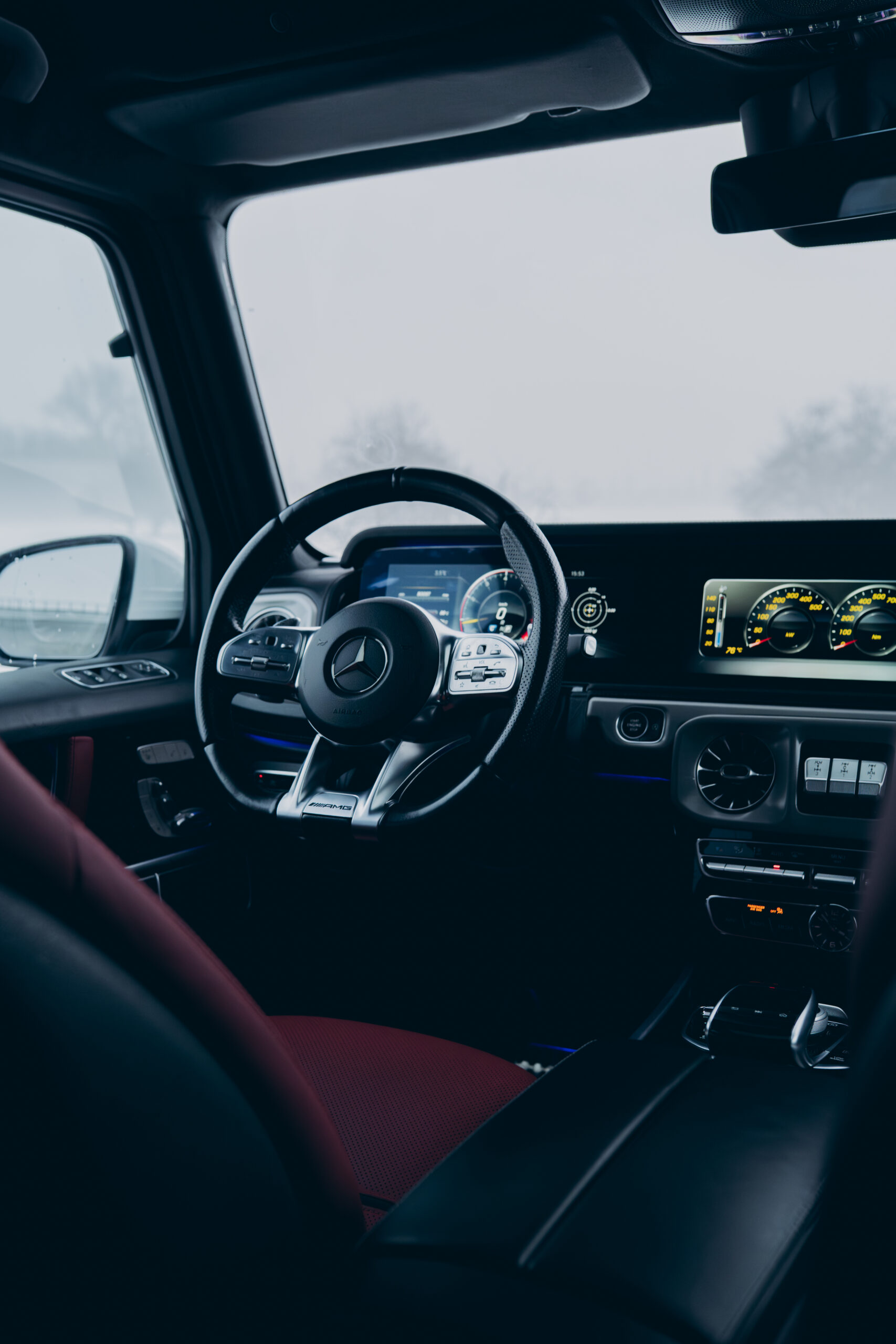 Wnętrze G63 w czerwonej skórze to wyrazisty kontrast wobec białego nadwozia – luksus i sport w najbardziej efektownym wydaniu.