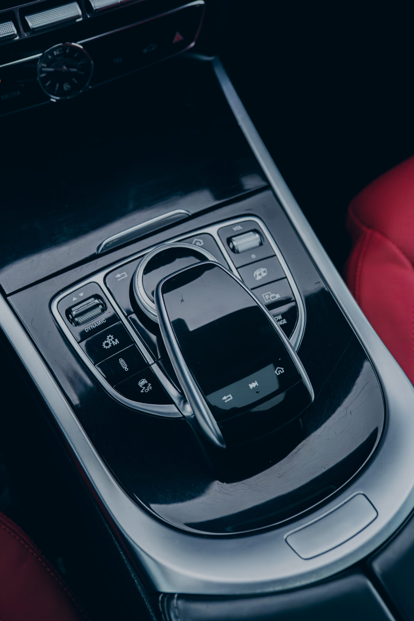 Deska rozdzielcza obszyta skórą nappa w kolorze czerwonym z kontrastowymi przeszyciami.